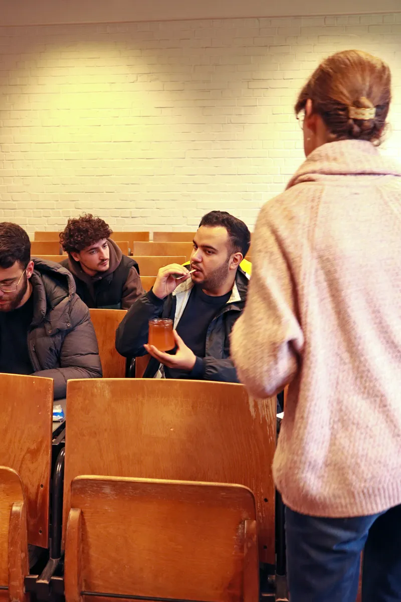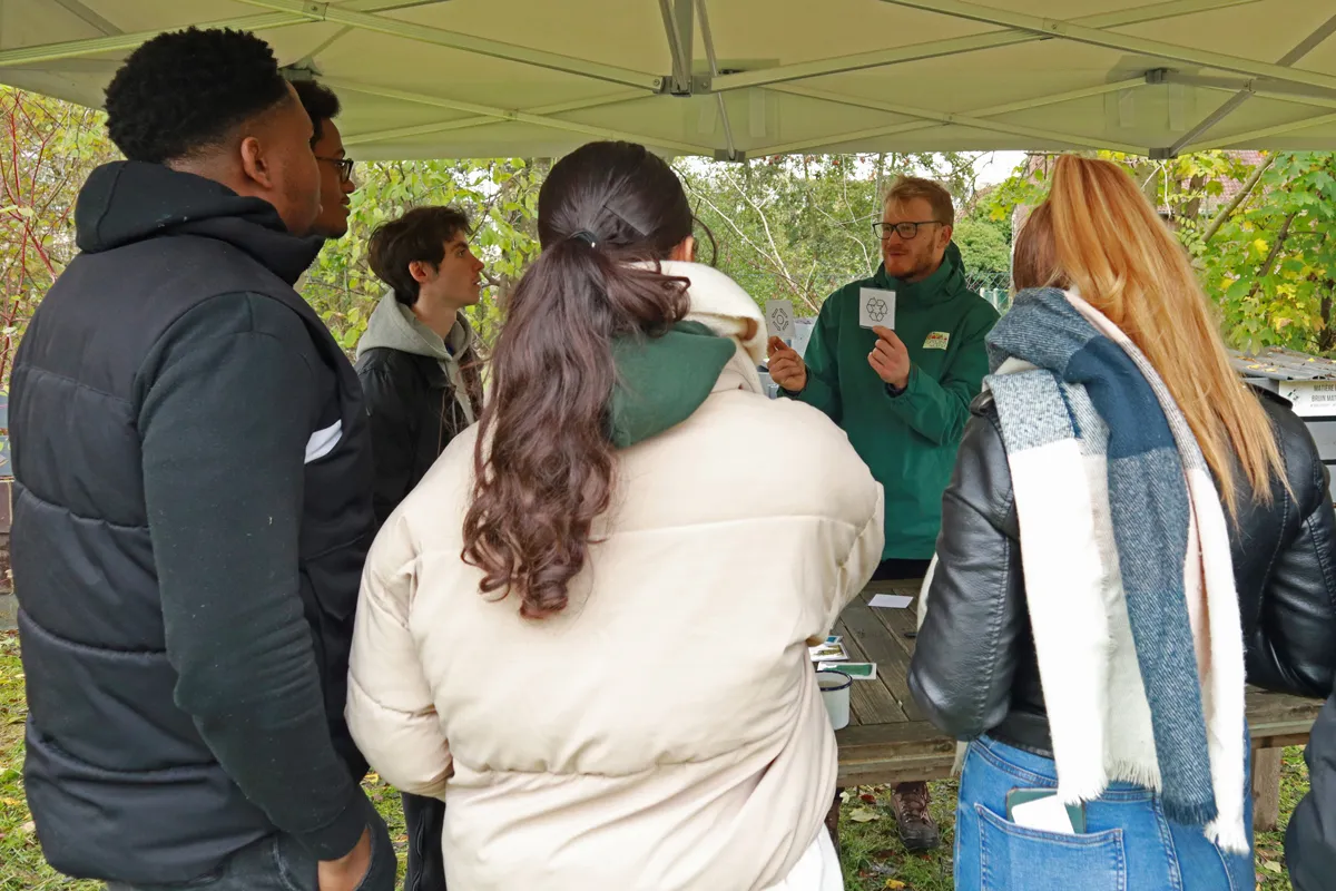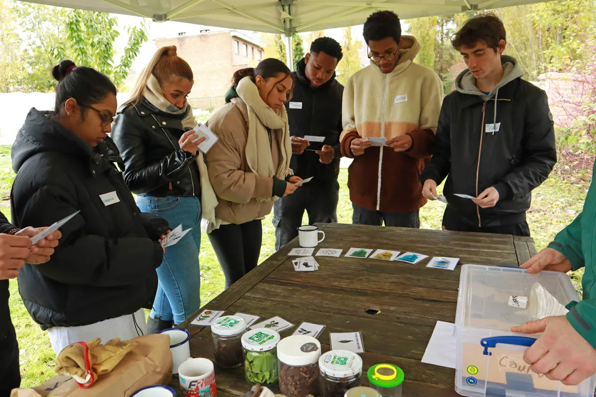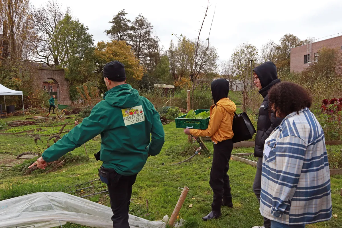À travers un focus sur l’alimentation, les étudiants de première année de la section gestion hôtelière (GH) ont découvert le projet des jardins du CERIA le 18 novembre 2022. Répartis en petits groupes, ils ont participé à plusieurs ateliers alternant entre pratique et théorie. Accompagnés par Edith Singleton, ils ont abordé le thème de l’alimentation saine et durable. Grâce à un exercice de photo-langage, chaque étudiant choisissait une ou deux images, expliquait ses choix, et ensemble, ils discutaient des bonnes et mauvaises habitudes, tant du point de vue de la santé humaine que de l’impact environnemental. Avec Antoine Morthier, les petits groupes sont passés à la pratique en participant à un atelier sur le compost. Quel est le cycle de la matière organique ? Qu’est-ce qui se recycle, et dans quelle poubelle ? Cet atelier, d’une grande importance, s’inscrit dans le cadre de la participation des GH à la récolte des déchets menée par les jardins sur le campus du CERIA pour alimenter le compost. Les étudiants ont également préparé et enrichi les sols pour l’hiver, période où les jardins du CERIA mettent la terre au repos. Les étudiants ont aussi découvert, grâce à Stéphane Passelecq, les herbes aromatiques cultivées dans le potager : des herbes connues, méconnues ou oubliées. Ils ont pu notamment cueillir de l’oseille, du thym, du romarin, de la coriandre, de la sauge, de la livèche (un céleri perpétuel) et trois variétés de menthe (marocaine, poivrée et fraise). Cet atelier a également permis de rappeler les grandes familles de légumes classées selon leur partie comestible et de revoir quels légumes sont de saison sous notre latitude belge. Autre volet de cette journée didactique : l’apiculture. Eh oui, les jardins du CERIA s’occupent également de ruches ! Avec Claire Gillet, de l’asbl « Le nez dehors », les GH ont découvert les produits de la ruche (miels d’été, de printemps, etc.), appris les différences entre les abeilles domestiques (présentes au rucher et productrices de miel) et les abeilles sauvages (essentielles pour la pollinisation, cruciale pour notre survie). Les étudiants ont également appris les différents rôles au sein d’une ruche (reine, ouvrière, ventileuse, faux bourdon, etc.) et les activités des abeilles selon les saisons. Autre volet de cette journée didactique : l’apiculture. Eh oui, les jardins du CERIA s’occupent également de ruches ! Avec Claire Gillet, de l’asbl « Le nez dehors », les GH ont découvert les produits de la ruche (miels d’été, de printemps, etc.), appris les différences entre les abeilles domestiques (présentes au rucher et productrices de miel) et les abeilles sauvages (essentielles pour la pollinisation, cruciale pour notre survie). Les étudiants ont également appris les différents rôles au sein d’une ruche (reine, ouvrière, ventileuse, faux bourdon, etc.) et les activités des abeilles selon les saisons.