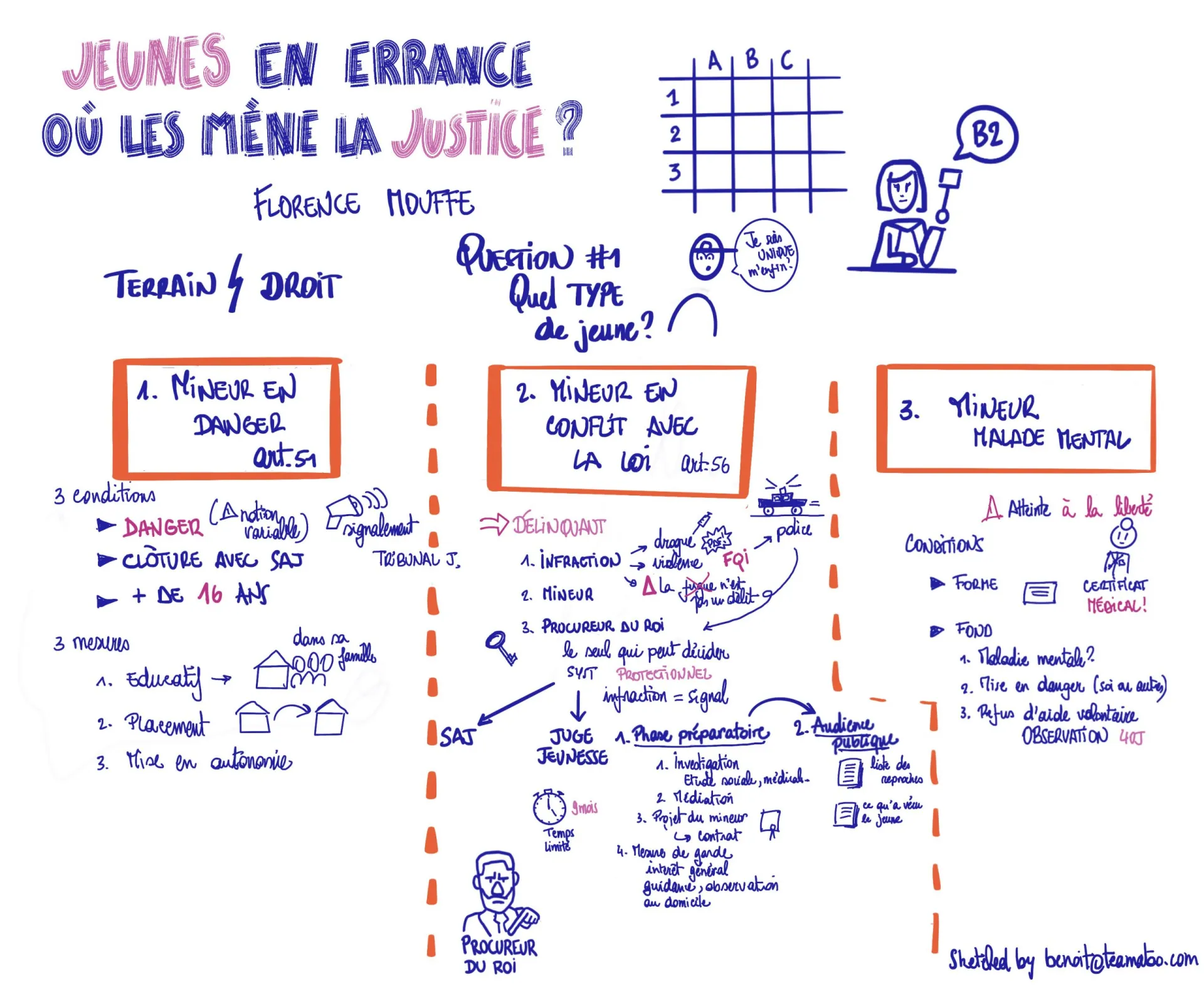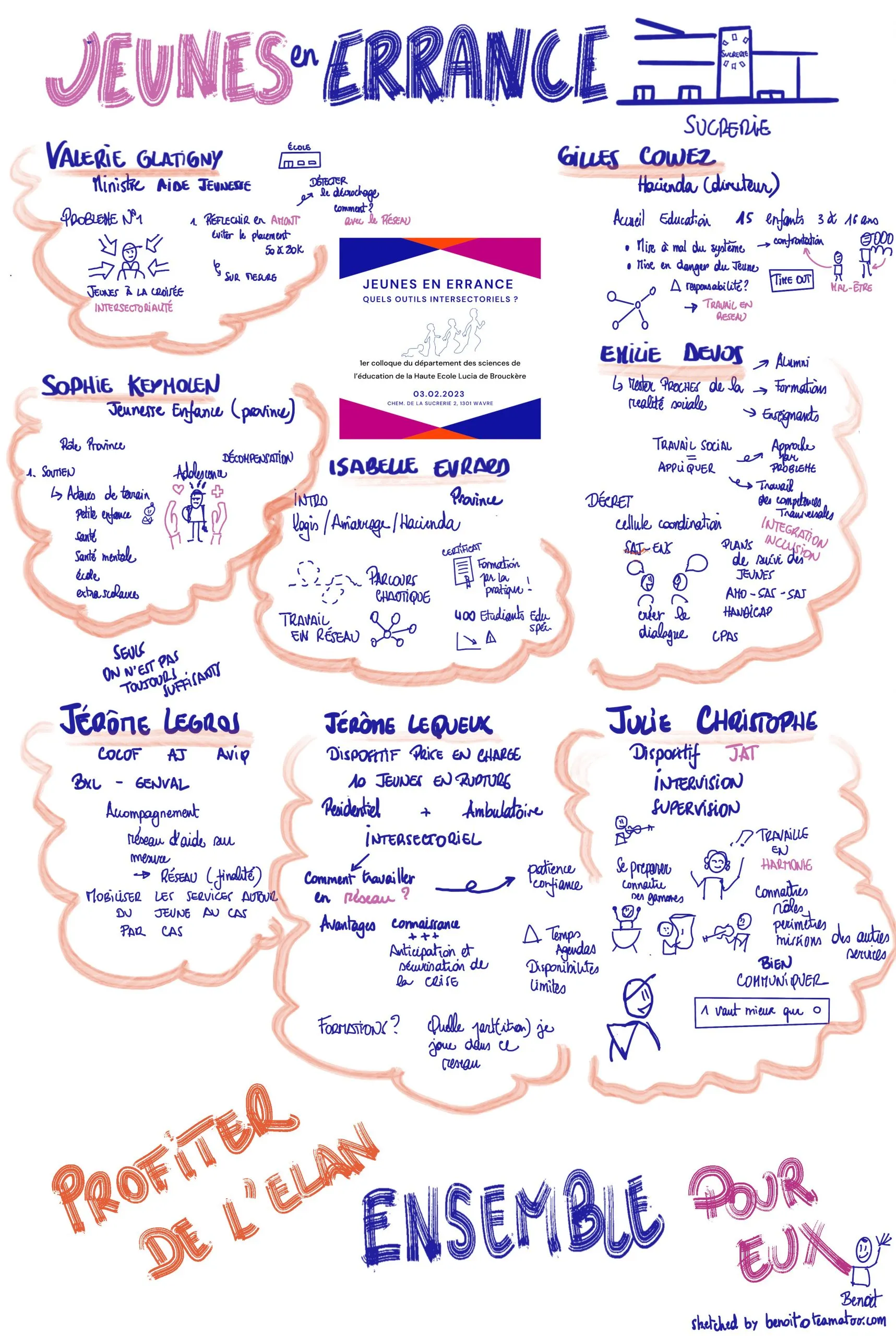 Le 3 février 2023, la HELdB organisait un colloque, le premier du département des sciences de l’éducation, sur la thématique des jeunes en errance. Près de 500 participants se sont retrouvés à La Sucrerie, à Wavre, pour rencontrer et échanger avec les professionnels invités. Les étudiants de la section éducateur spécialisé étaient également conviés afin d’être au centre des échanges et d’acquérir de nouvelles connaissances. La HELdB a à cœur d’offrir une formation concrète à ses étudiants et de renforcer leur apprentissage par une approche de terrain. Présentations des intervenants Téléchargez (au format PDF) les présentations de certains des professionnels présents au colloque de la HELdB : Intervention de Thierry Verdeyen – « En Terre-1-Connue, un outil intersectoriel pour les jeunes à la frontière de trois secteurs » Intervention de Marlène Michel – « Quand l’enfant blessé disparaît dans l’ombre de l’adolescent violent » Intervention de Grégoire Nyssens et Marilena Casale – « Quelle transition vers la majorité pour les ados en institution ? » Intervention de François Desormiers et Éric Saint-Jean – Grandir ensemble Intervention de Florence Mouffe – « Jeunes en errance : où les mène la Justice ? » Sketchnoting : Benoît Degrange